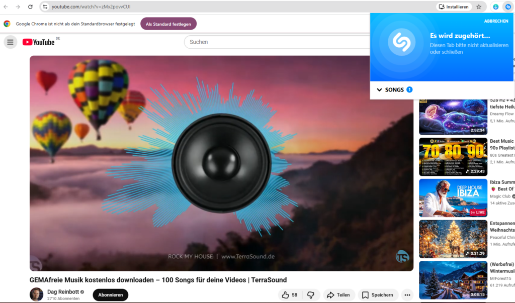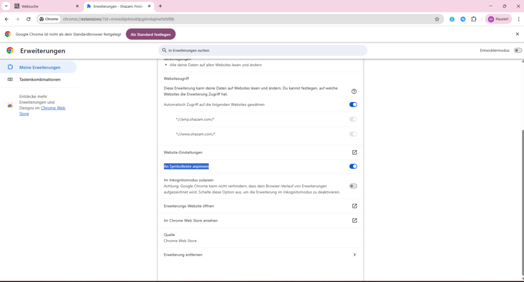 Erwweiterung Shazam installieren. Oben rechts auf die 3 Punkte gehen ⇾ Erweiteungen ⇾ Erweiterungen auswählen. Dann bei „Shazam“ auf „Details gehen. Dort bei „An Symbolleiste anpinnen“ den Regler nach rechts schieben.